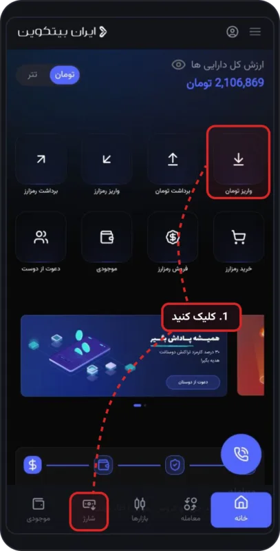 - روی گزینه «شارژ» یا «واریز تومان» کلیک کنید.