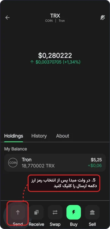 2. گزینه Send (ارسال) یا Withdraw (برداشت) را بزنید.