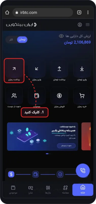 وارد پنل کاربری خود شوید و از صفحه اصلی روی گزینه «برداشت رمز ارز» کلیک کنید.