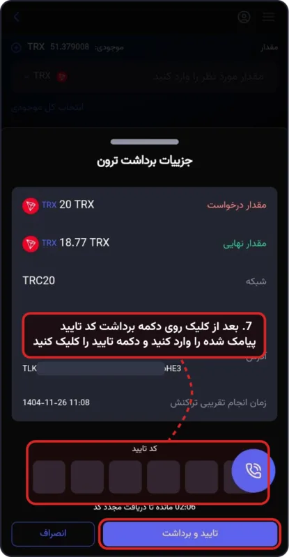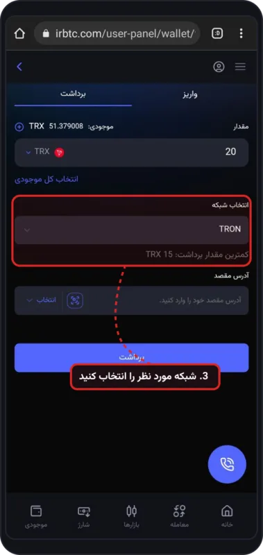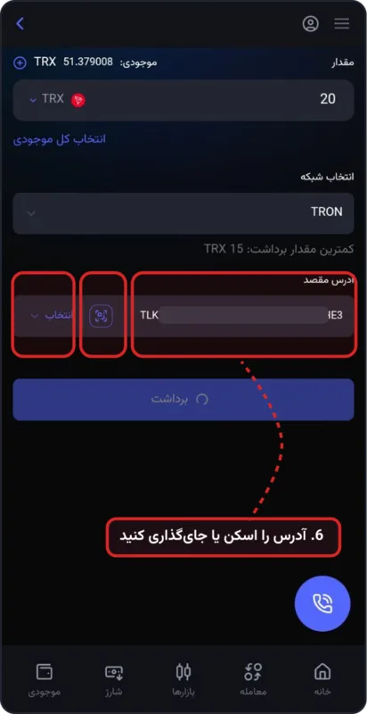 • آدرس کپی‌شده را در فیلد مربوطه پیست کنید یا از طریق اسکن QR وارد نمایید.