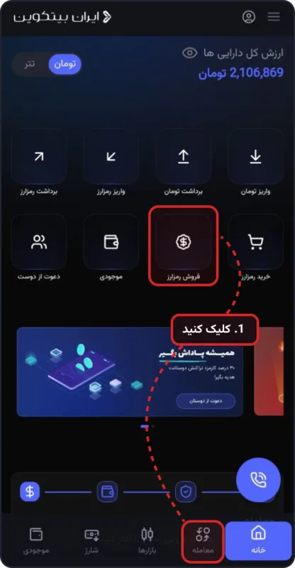 از صفحه اصلی یا نوار ابزار بالای سایت، روی گزینه «فروش رمز ارز» کلیک کنید.