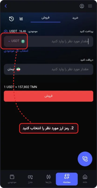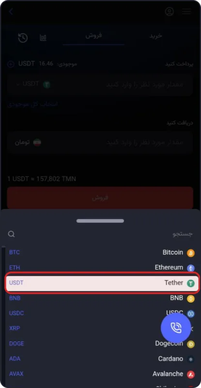 از لیست داراییهای خود، ارزی که قصد فروش آن را دارید انتخاب نمایید.